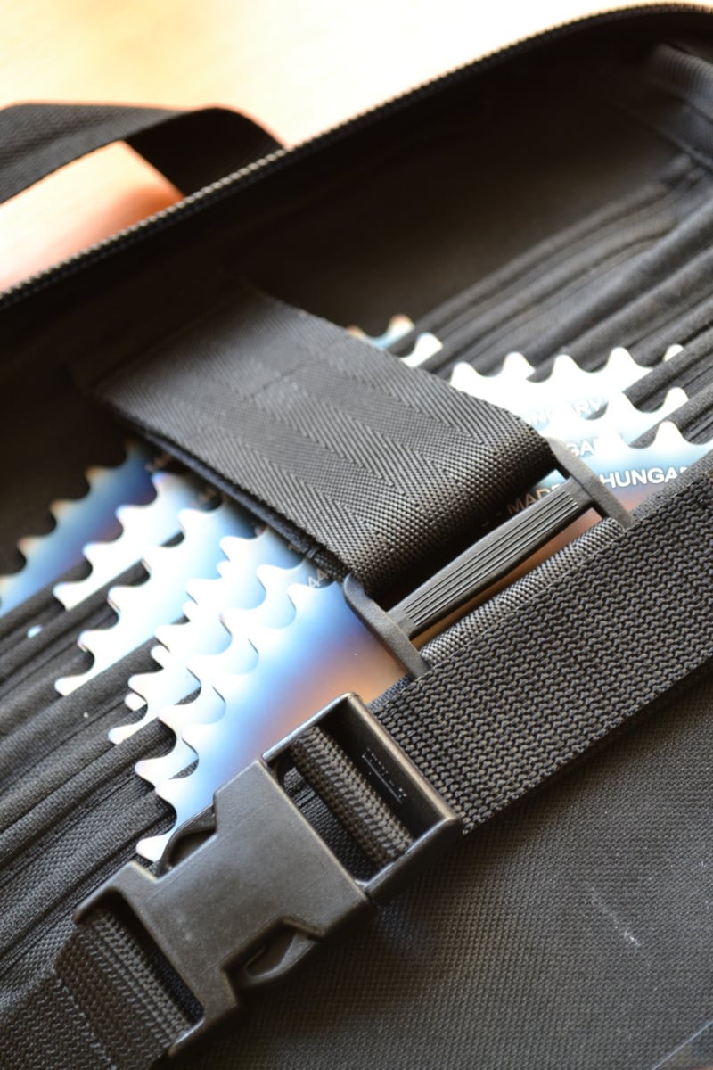 We designed this bag so you can carry all the essential tools for track cycling, even a chain whip. It can hold up to 12 chainrings (from 59t to 64t, just so you know) and 7 different cogs.